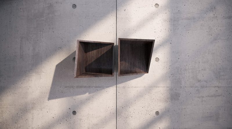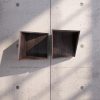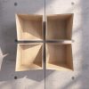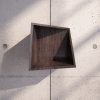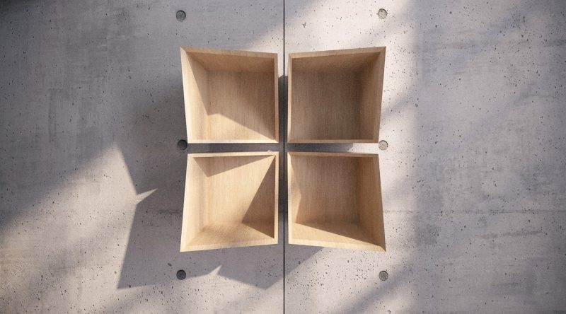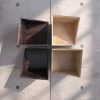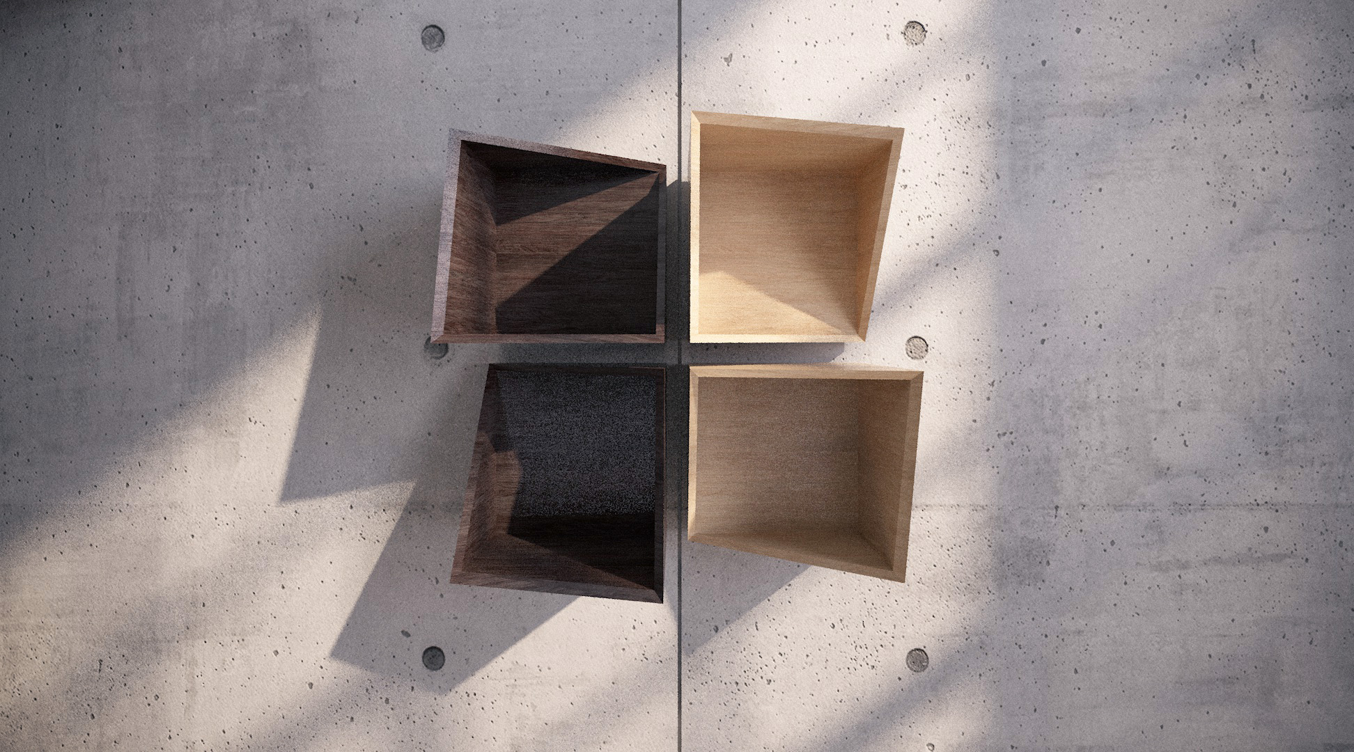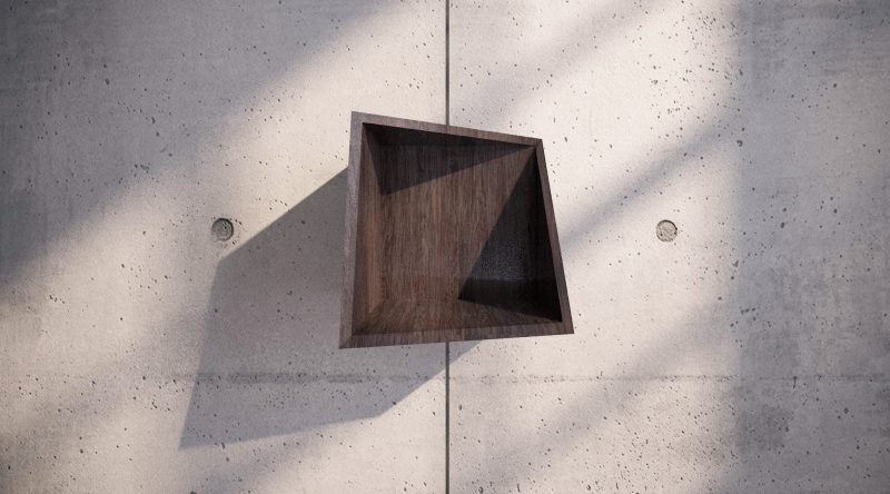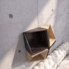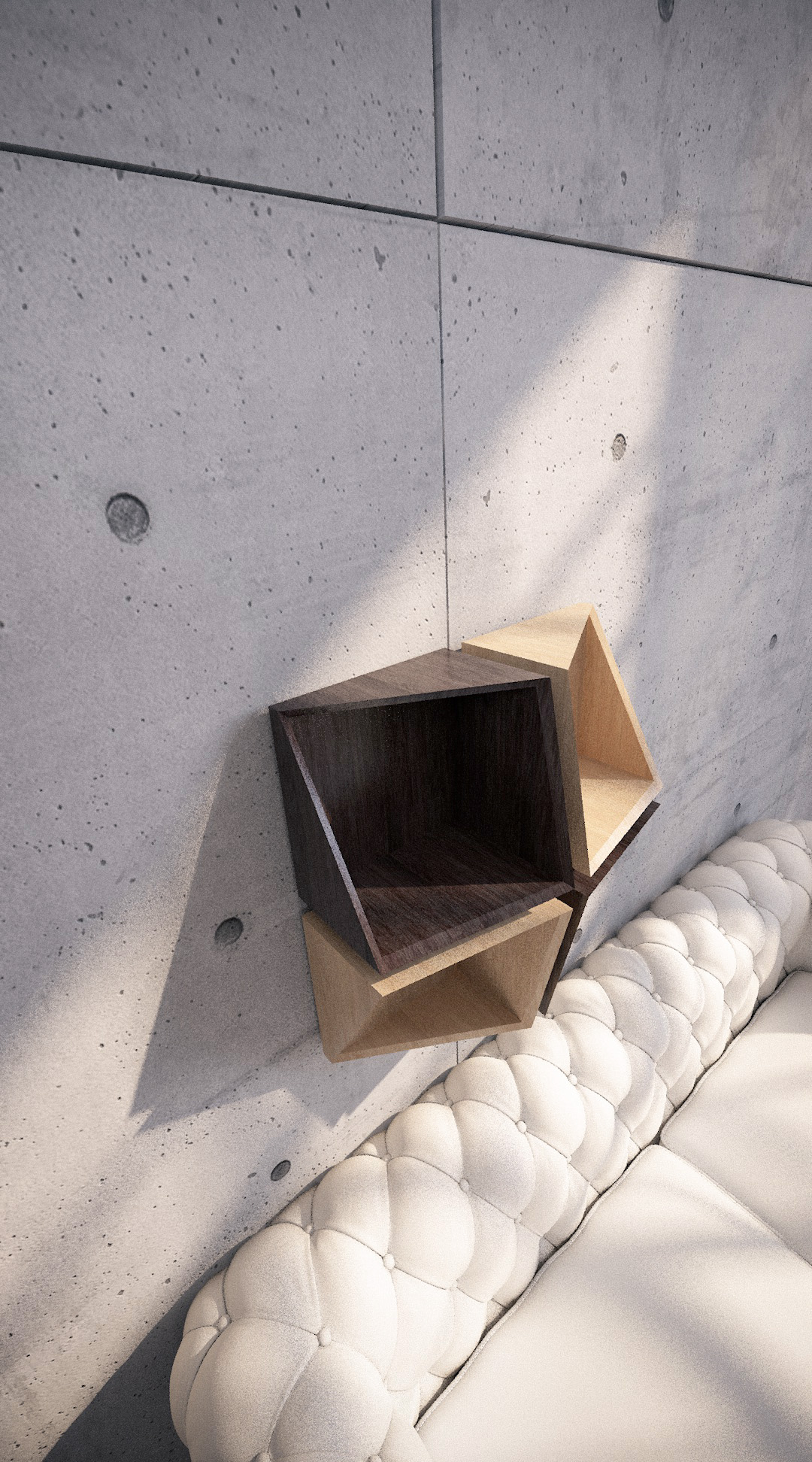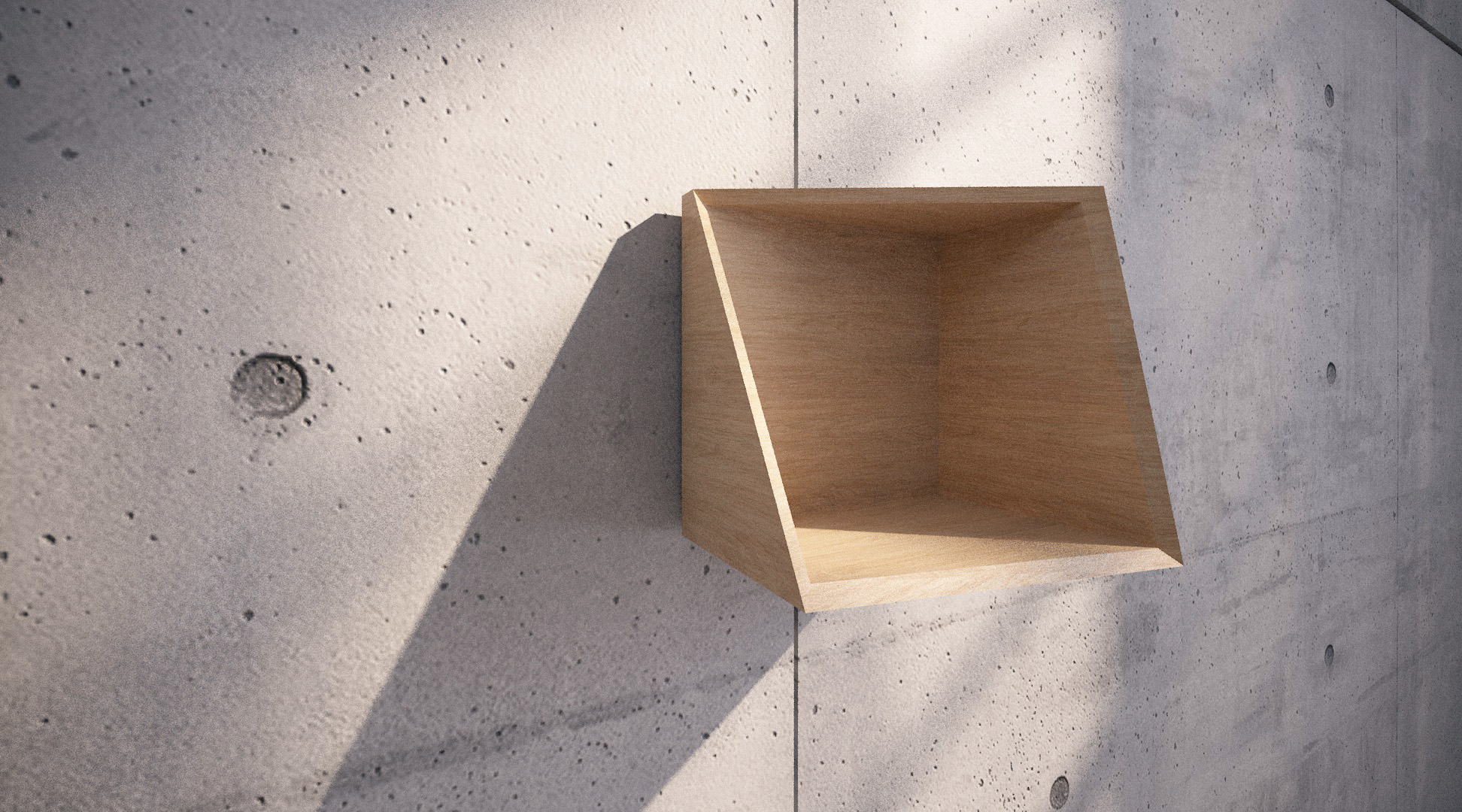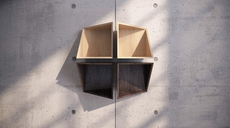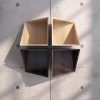 Ein Regalelement in Würfelform, welches multipliziert spannende Formationen kreiert. Filigrane Holzkonstruktion (Materialstärke 10mm) auf Gehrung mit schrägen Kanten. Kernesche natur oder dunkel gebeizt.