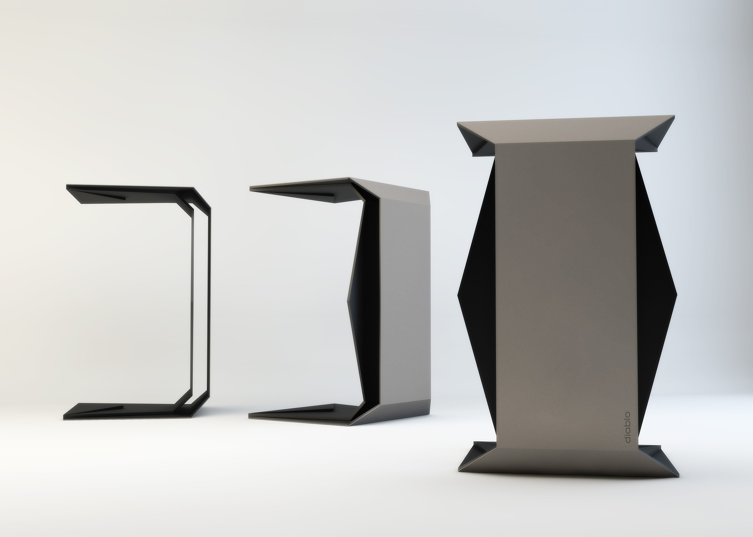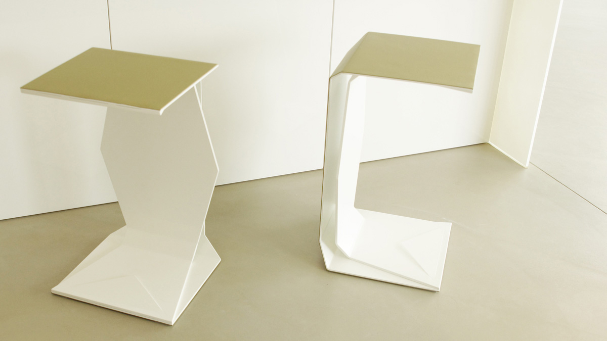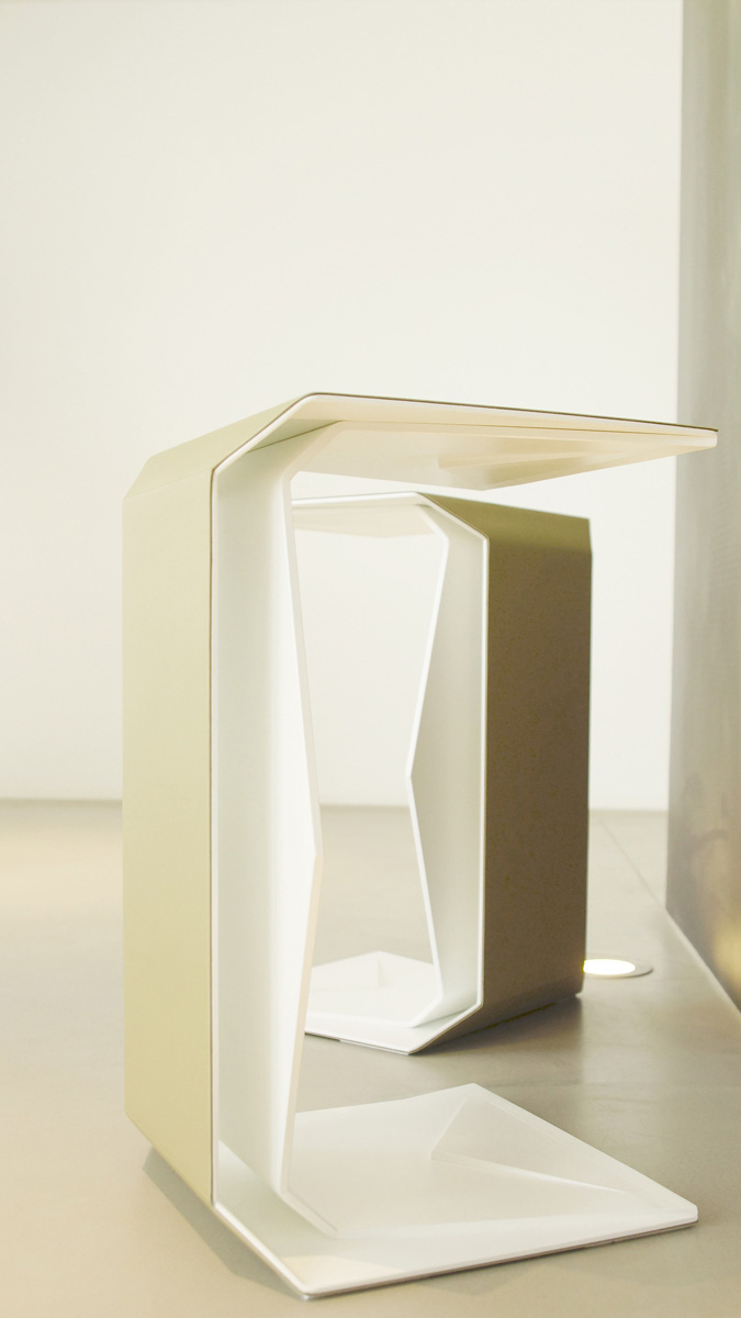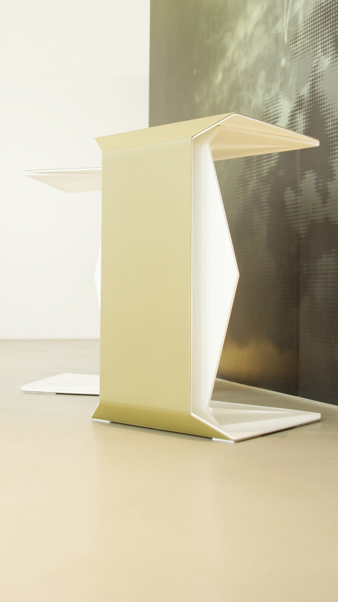 Die «trek-diablo» Möbelserie besteht aus Hocker und verschiedenen Tischvarianten. Das markante Design ist geprägt durch zwei in sich verbundene Bestandteile mit schnittigen Ecken und Kanten. Aluminium mit schwarzer tiefmatter Pulverbeschichtung wird als Grundmaterial verwendet. Die Oberfläche wird mit natürlichem Desktop-Material überzogen und ist in verschiedenen Farbtönen (pebble, mauve, olive, mocha, brandy, carbon, etc.) erhältlich. In der neuen ‚Angel-Edition‘ ist der Aluminium-Inlay auch in weisser tiefmatter Ausführung erhältlich. Der Preis gilt für Hocker ab 2 Ex., Tischvarianten und Hocker in Kleinserien ab 8 Ex. – auch auf Anfrage. (Betreffend Desktop-Farbauswahl kontaktieren wir Sie nach dem Bestellvorgang.)