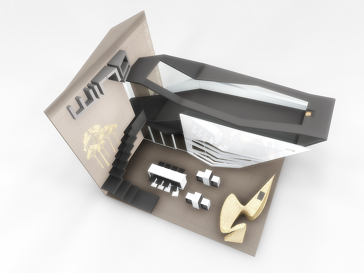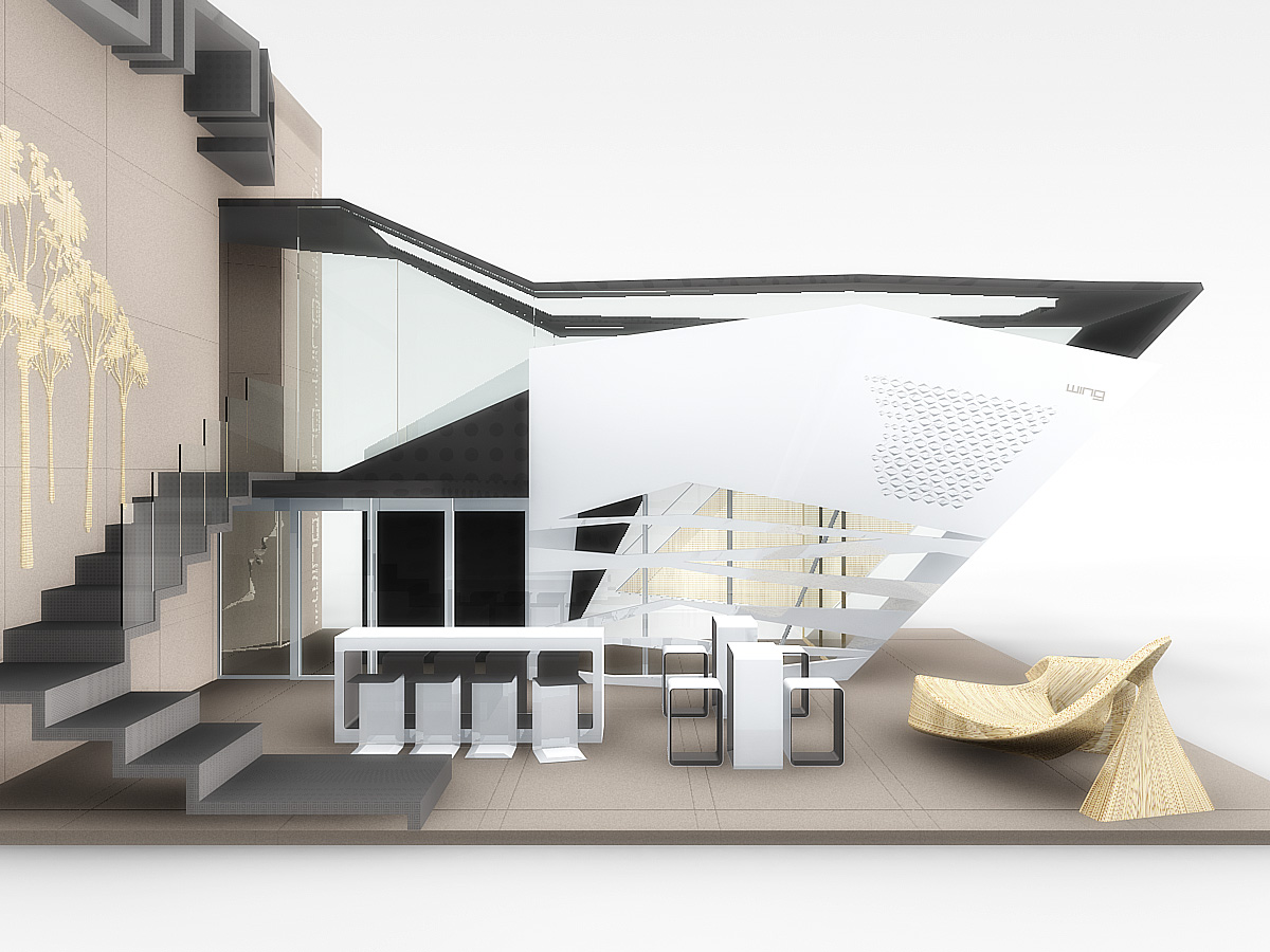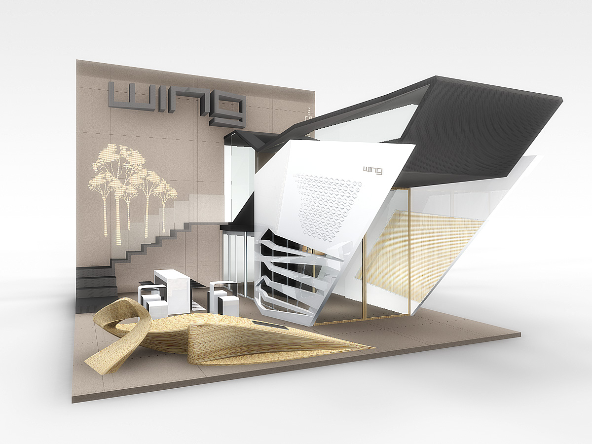 Mit “wing12″ wagen wir uns an eine zweigeschossige Messekonstruktion mit einer erhabenen Aussichtsplattform über die 10x10m grosse Gesamtfläche. Eine schlichte Basisplattform bietet Raum und Übersicht auf die einzigartige Wingskulptur, welche als Dreh- und Angelpunkt zur Präsentation der verschiedenen Produkteinnovationen des Ausstellers funktioniert. Über den ‚Artpark‘, mit Meetingzone und kunstvoll gefertigten Skulpturen, erfolgt der Aufstieg zum Flügel, welcher zusätzlichen Raum für individuelle Gespräche bietet. Ein faszinierendes Konzept mit spannenden statischen Herausforderungen und vielen optischen Feinheiten.