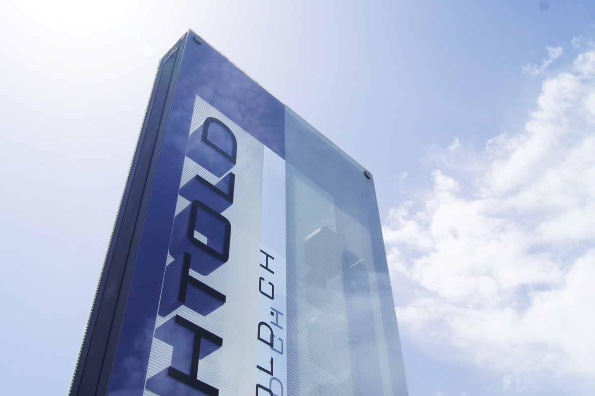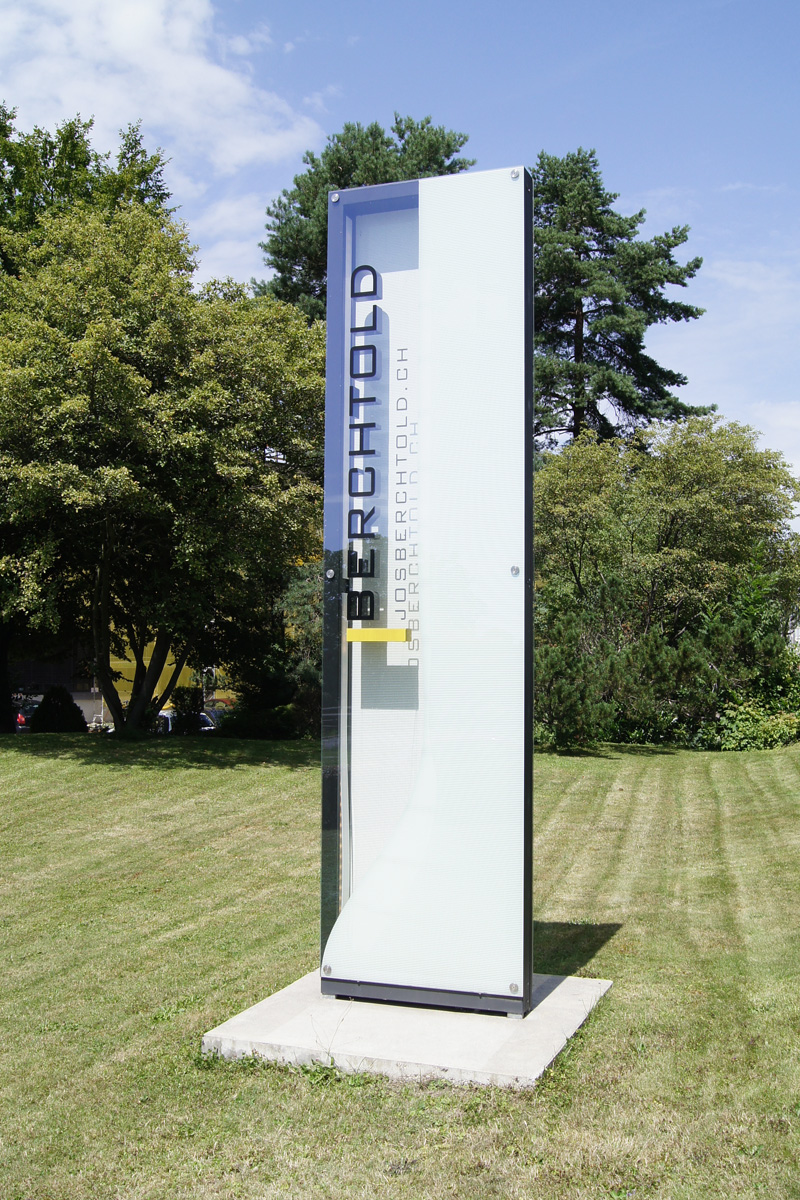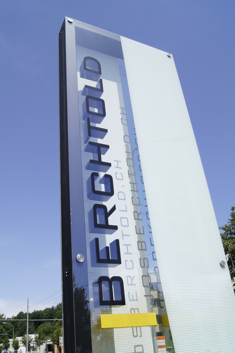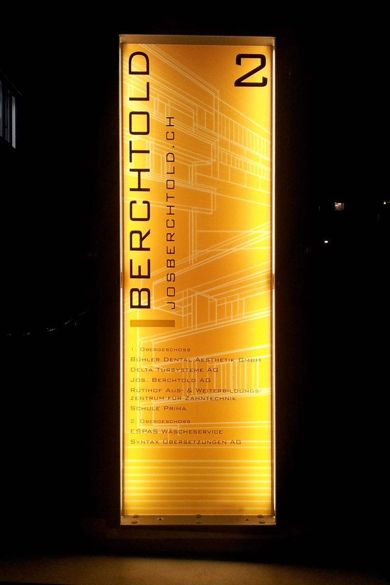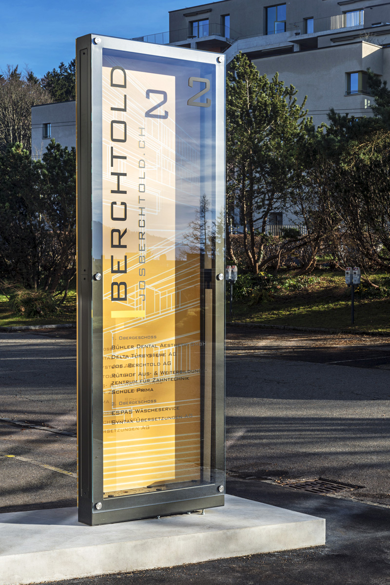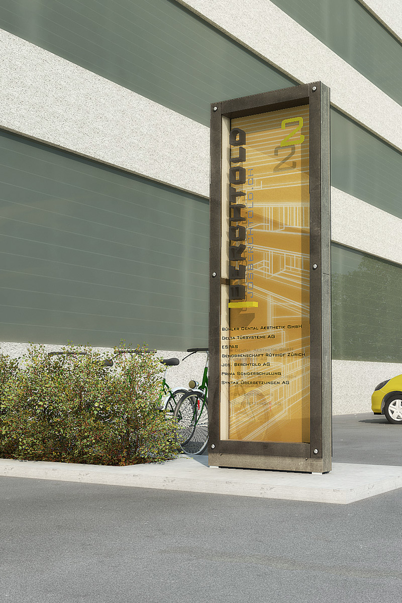 Two impressive, energy saving LED pylons are welcoming visitors. By using multy-layer concepts we achieved interesting 3D effects within the pylons. The realisation with steel, glass and a concrete fundament is aligned to the facing of the building. Translucent foils are resulting in interesting shadow effects trough natural light whilst the embedded LED lights are turning around the overall appearance at night.