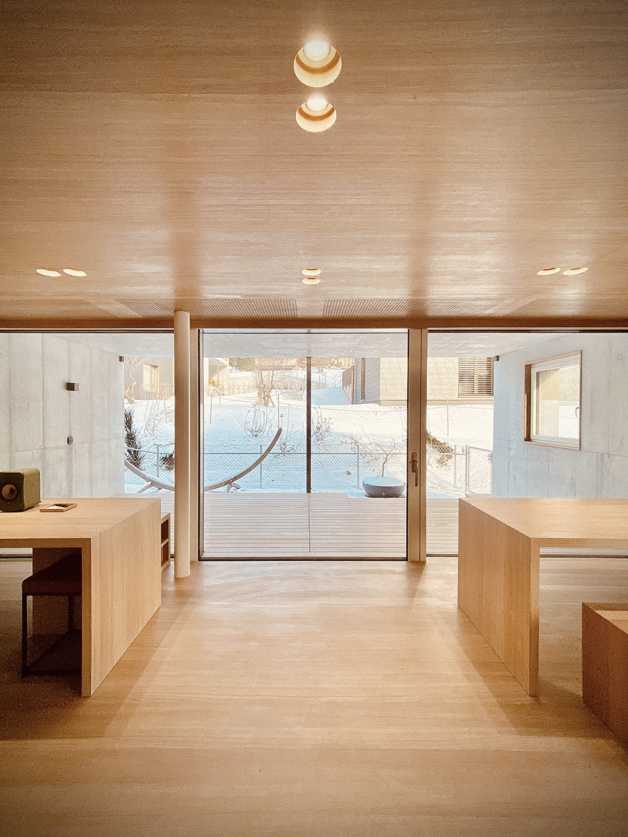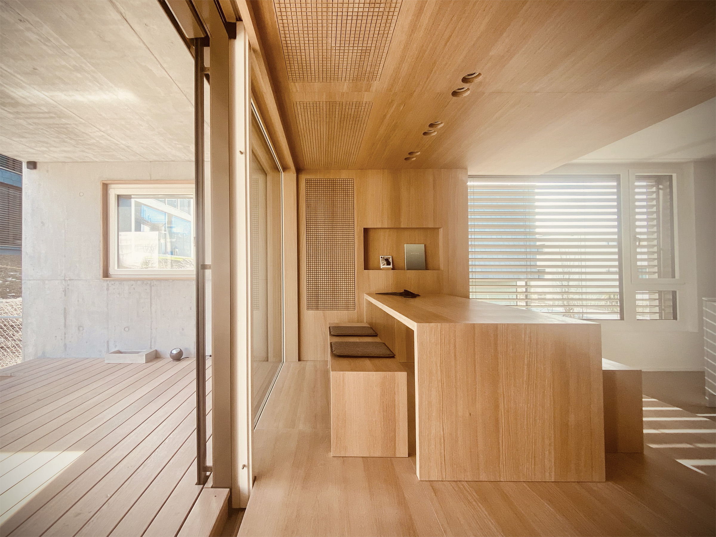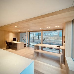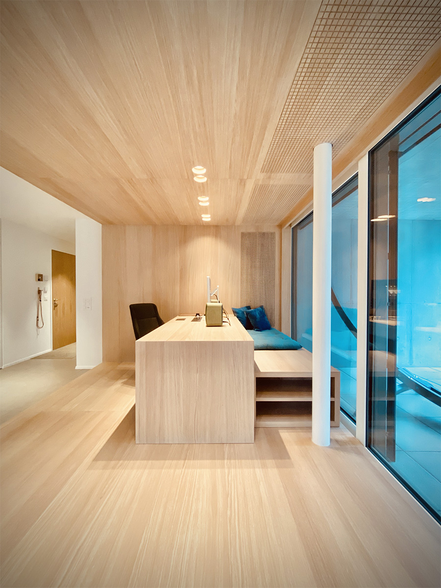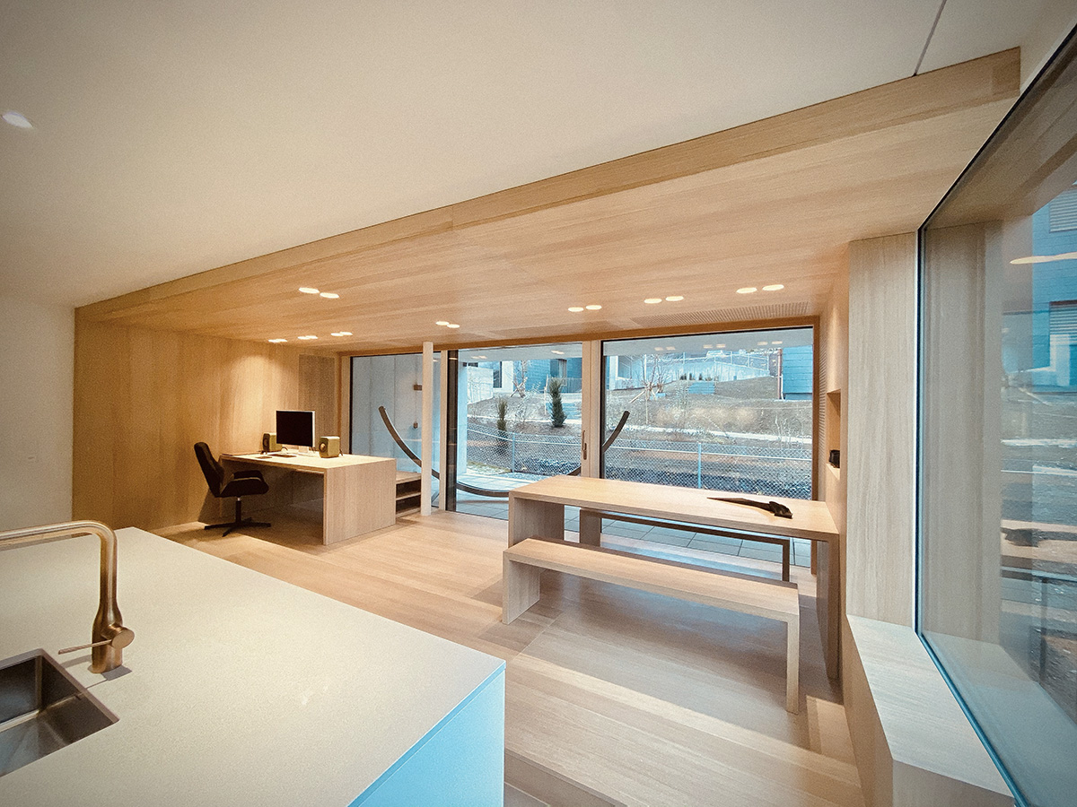 The combination of workplace and living space; framed in wood. An existing, already completed flat was the starting point, a fully integrated element construction was our approach to recreate this individual apartment extension to one harmonic unit. A perfectly coordinated lighting and audio concept completes the minimalist interior design and creates a unique feeling of living.