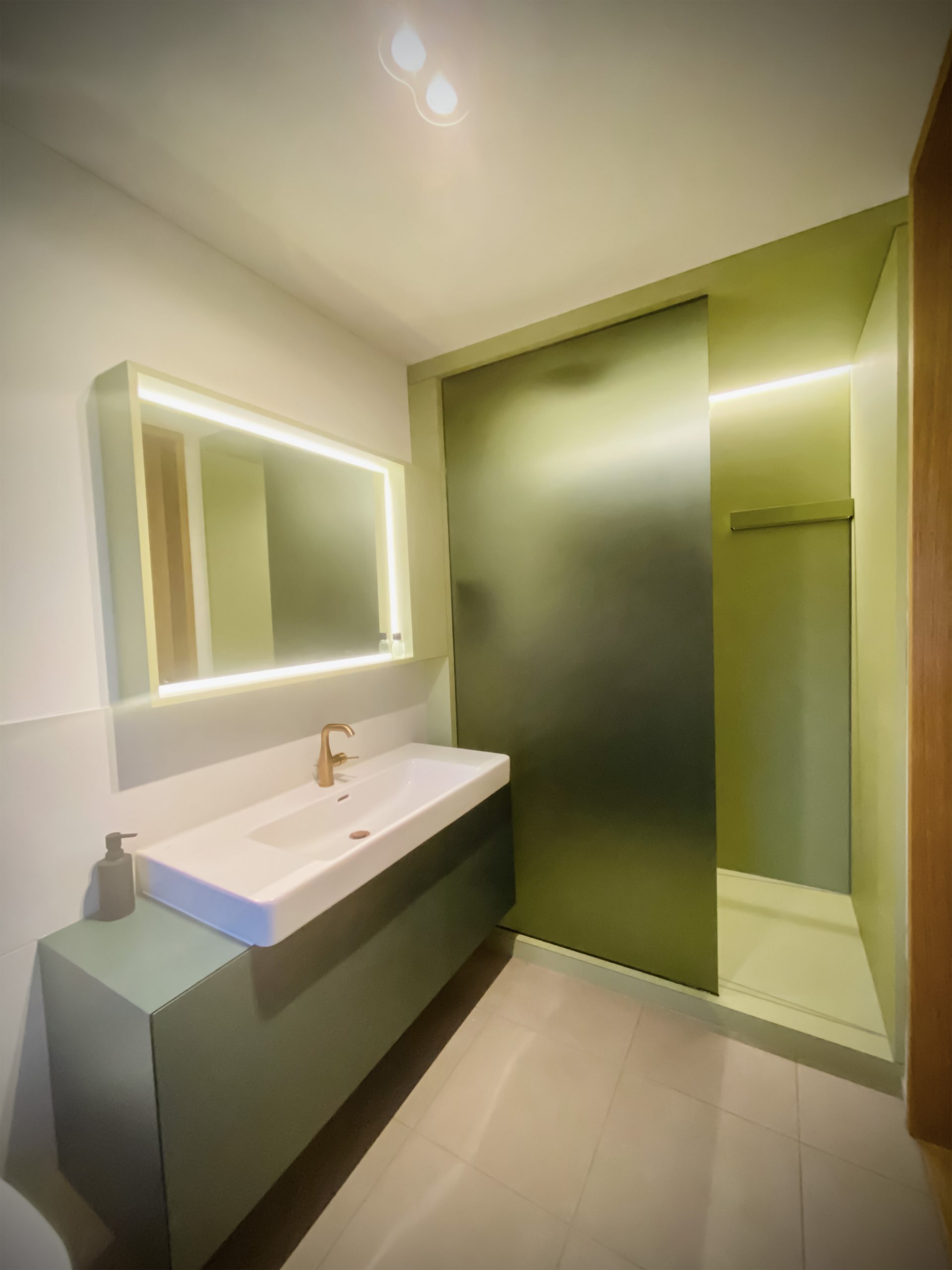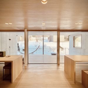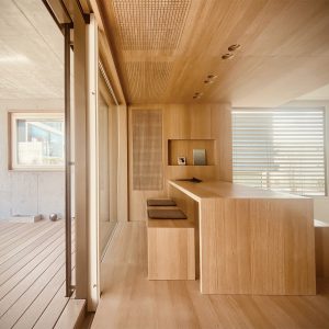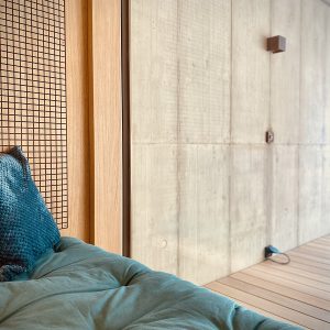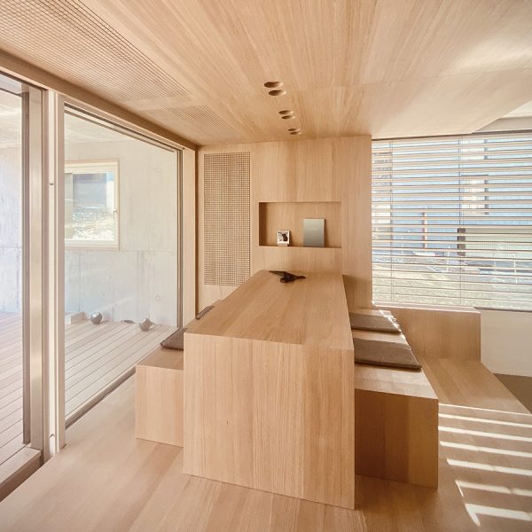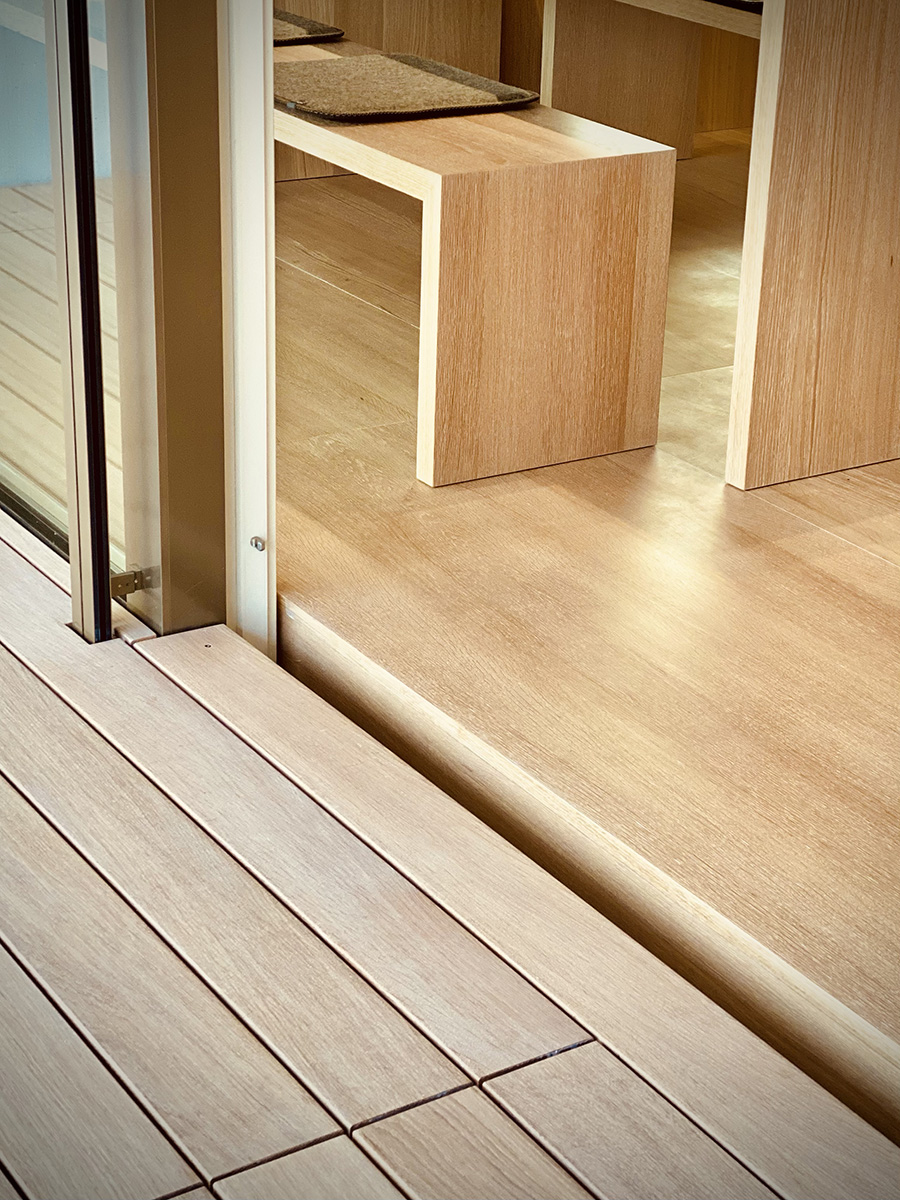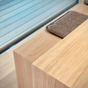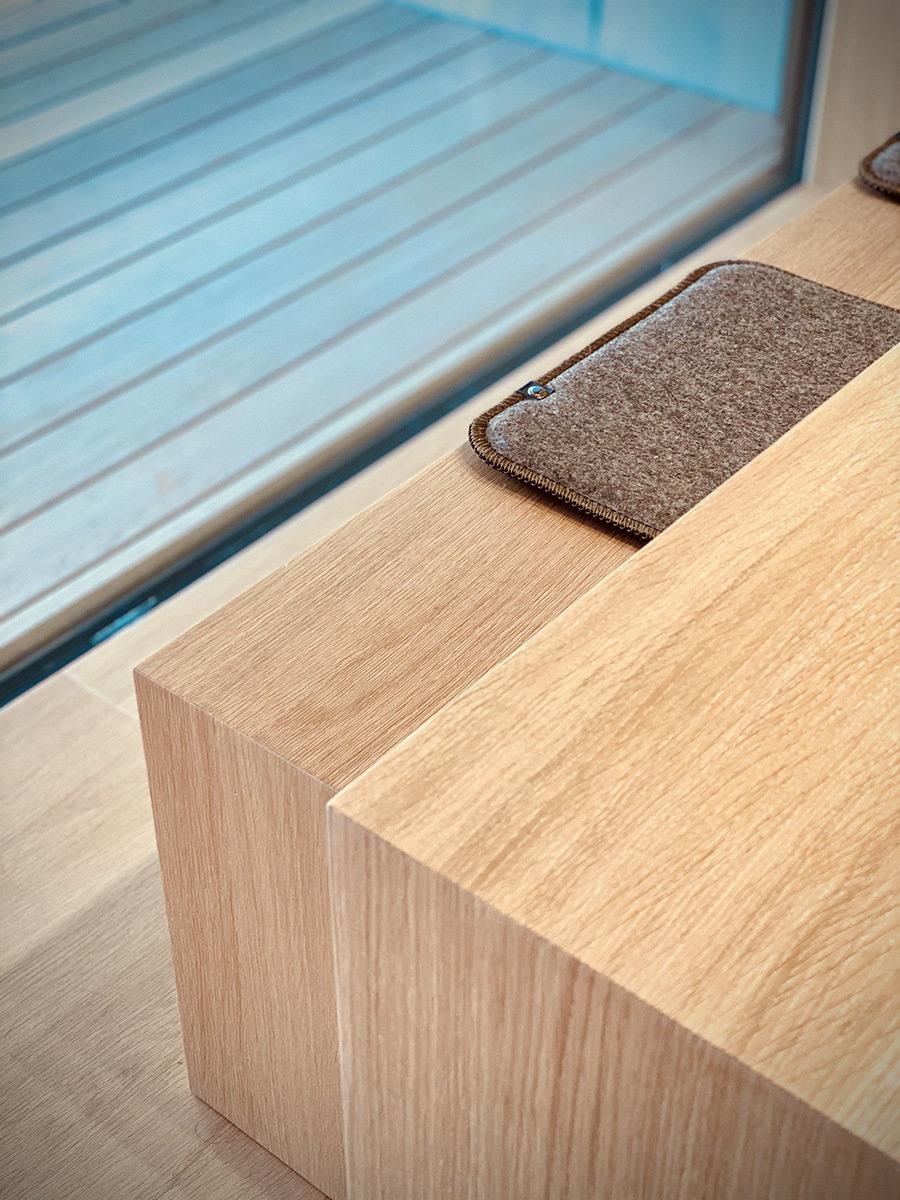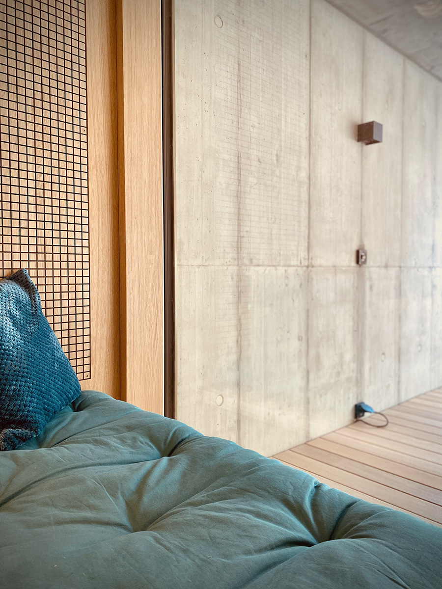 The combination of workplace and living space; framed in wood. An existing, already completed flat was the starting point, a fully integrated element construction was our approach to recreate this individual apartment extension to one harmonic unit. A perfectly coordinated lighting and audio concept completes the minimalist interior design and creates a unique feeling of living.