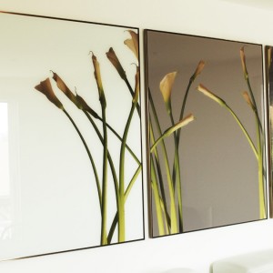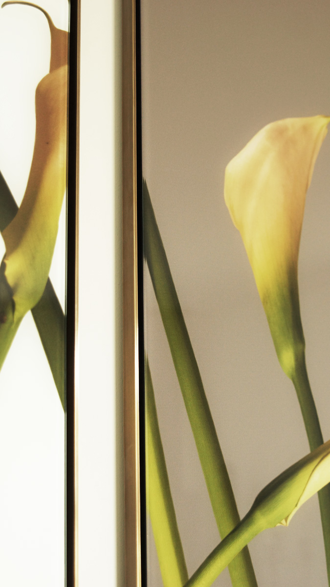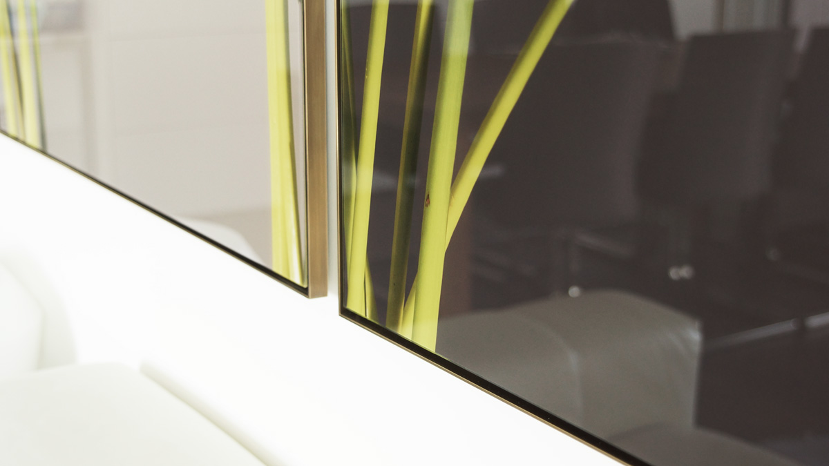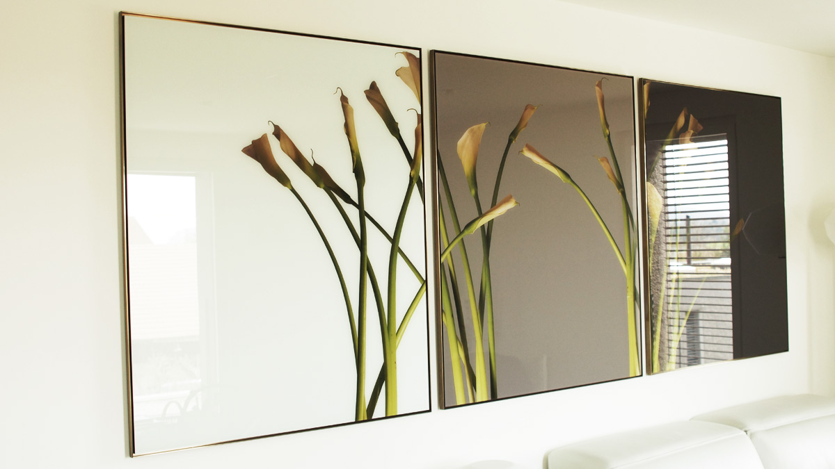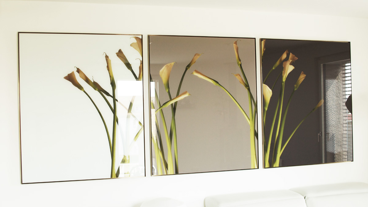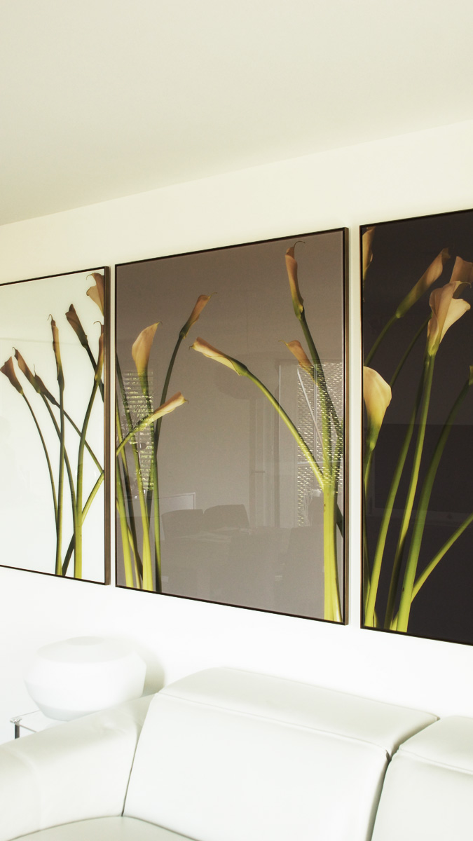 A private customer asked us to reproduce a individual flower design applied as a wall art element. With special post-production and by using diverse backgrounds we printed the final graphics on glass. A custom made framing with a brass profile in three parts resulted in the aimed visual impression.