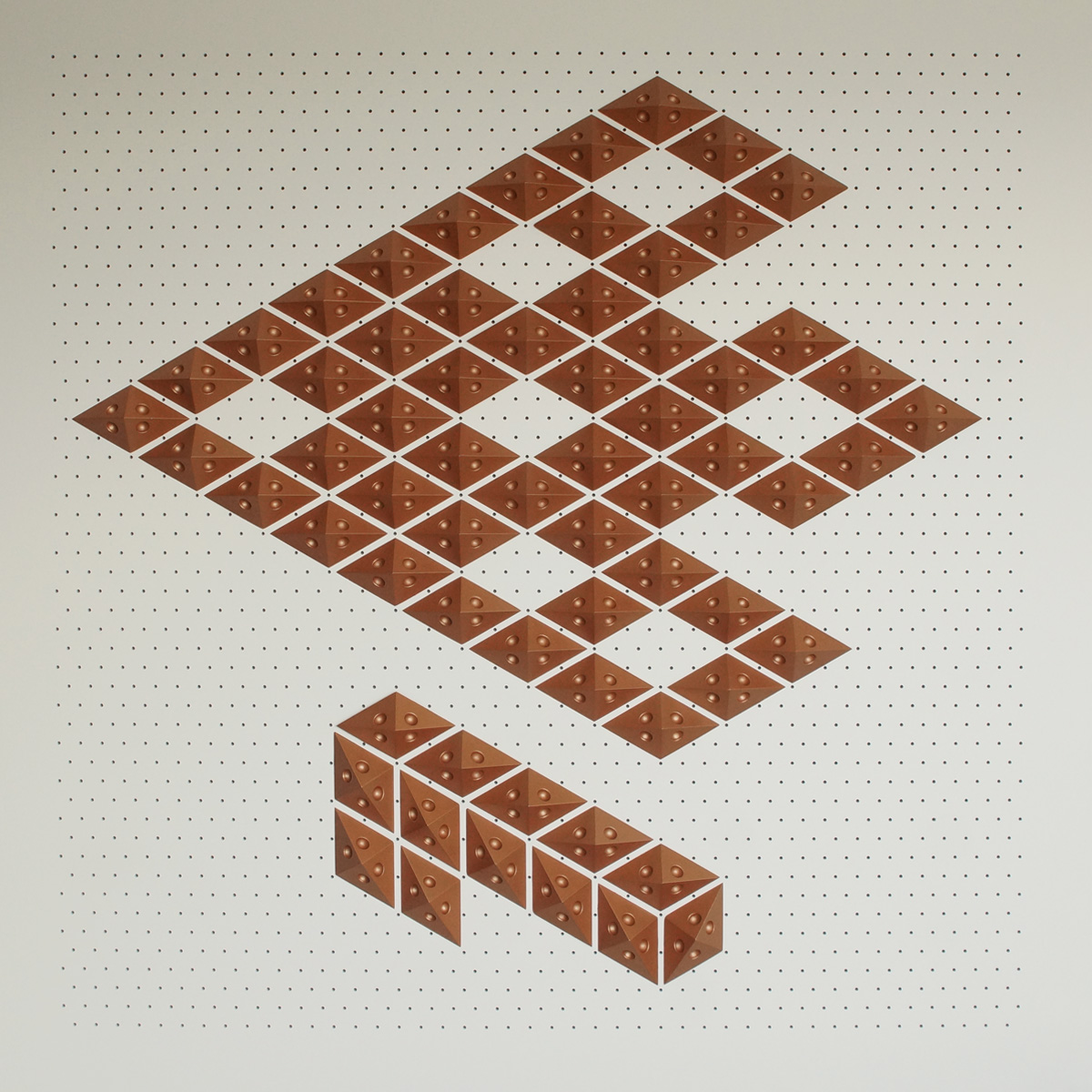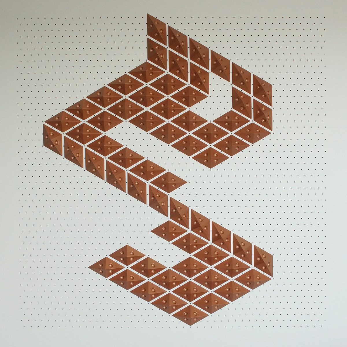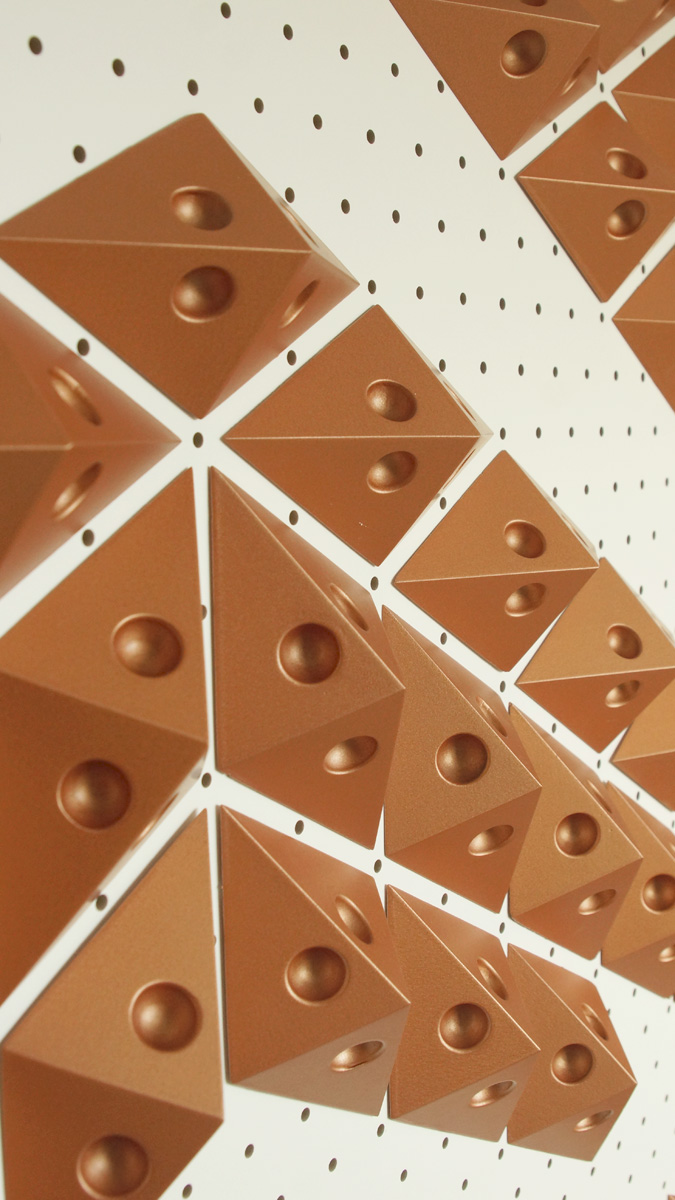 A perforated wall element and shiftable three dimensional shaped rhombs result in endless combinations of designing an individual picture. Finger sized notches unify a decorative element with practical grips, unleashing ones creativity. The bright, slightly reflective copper lacquering, combined with shadows drawn by light sources are underlining the result of an always changing overall image.