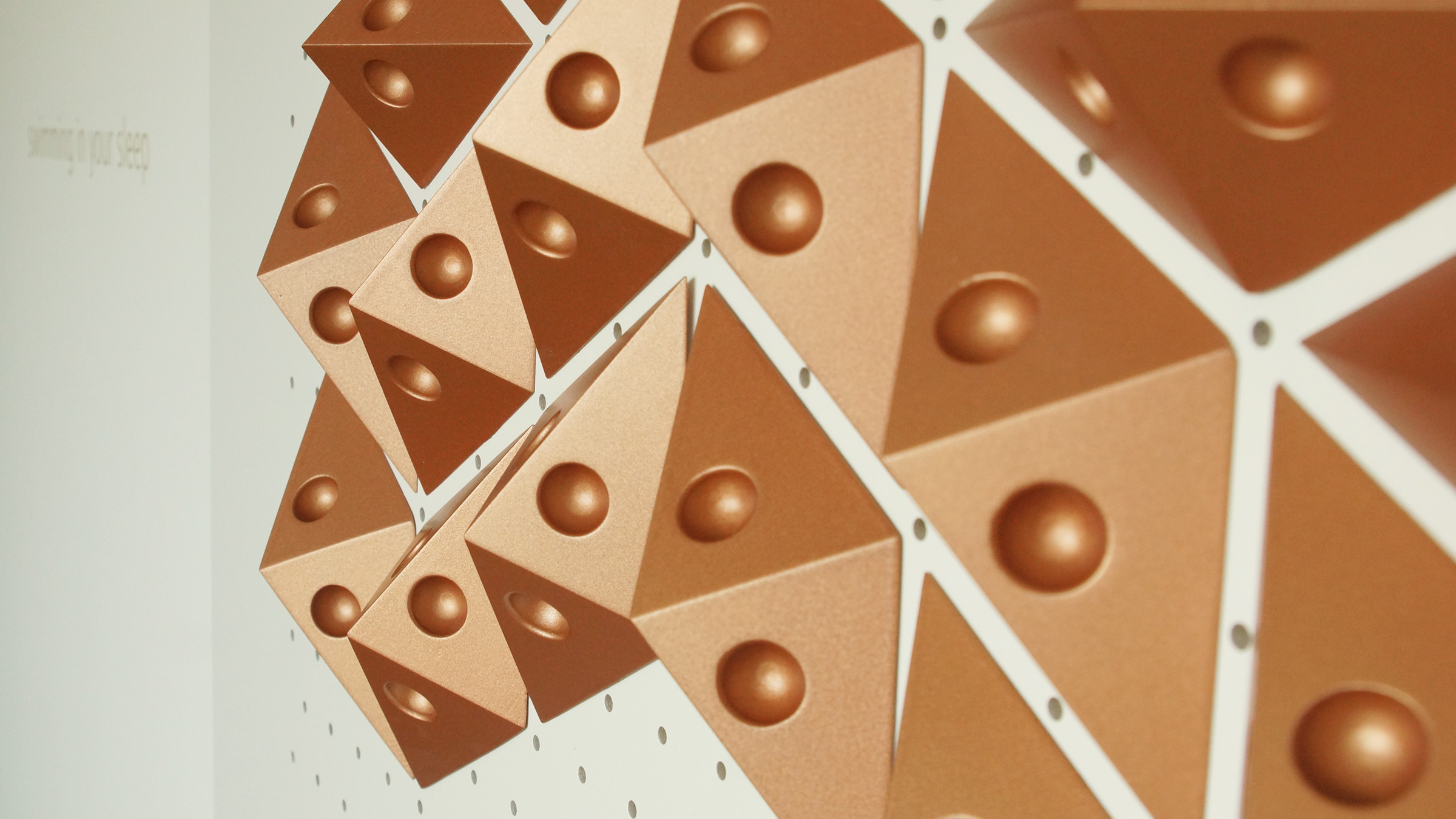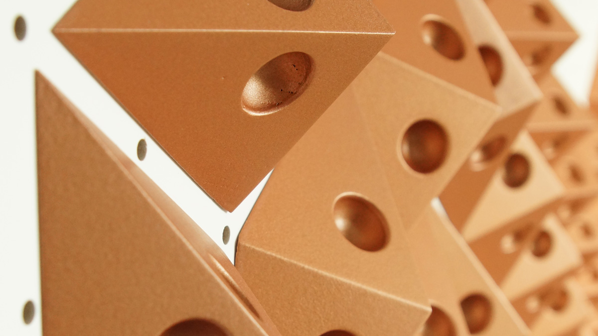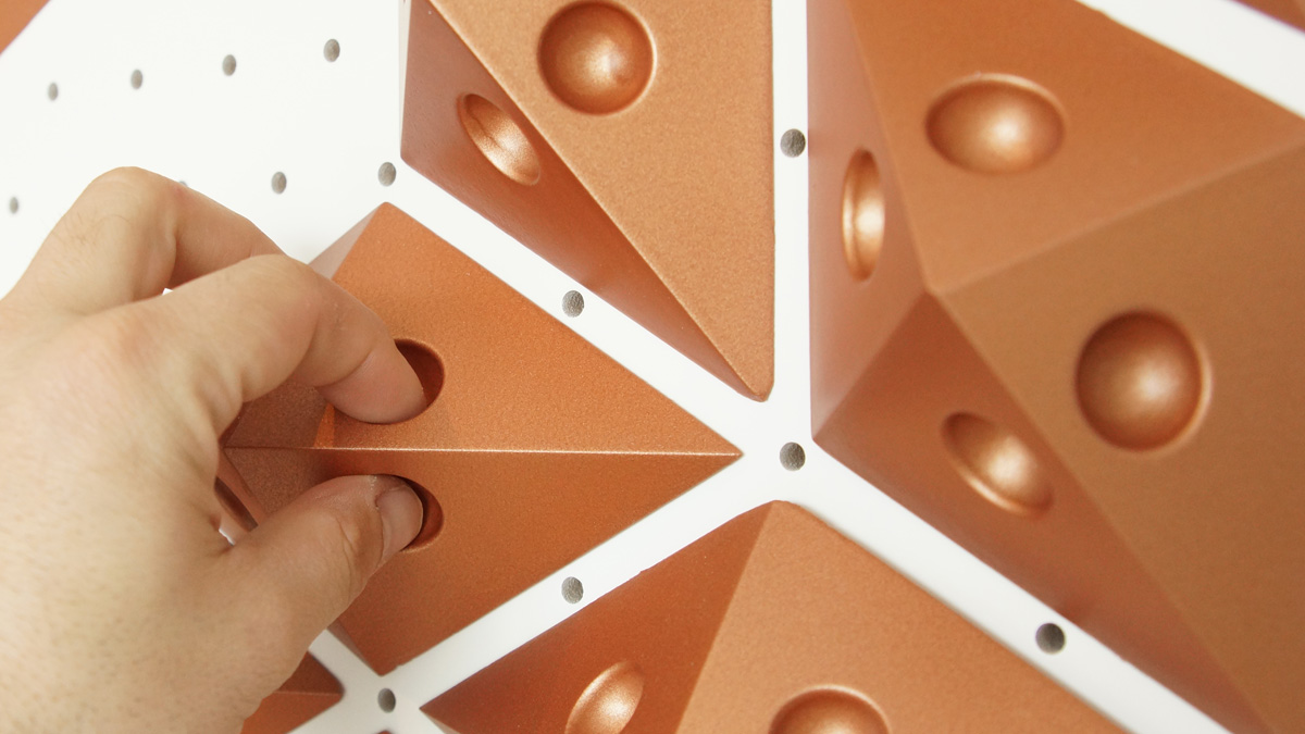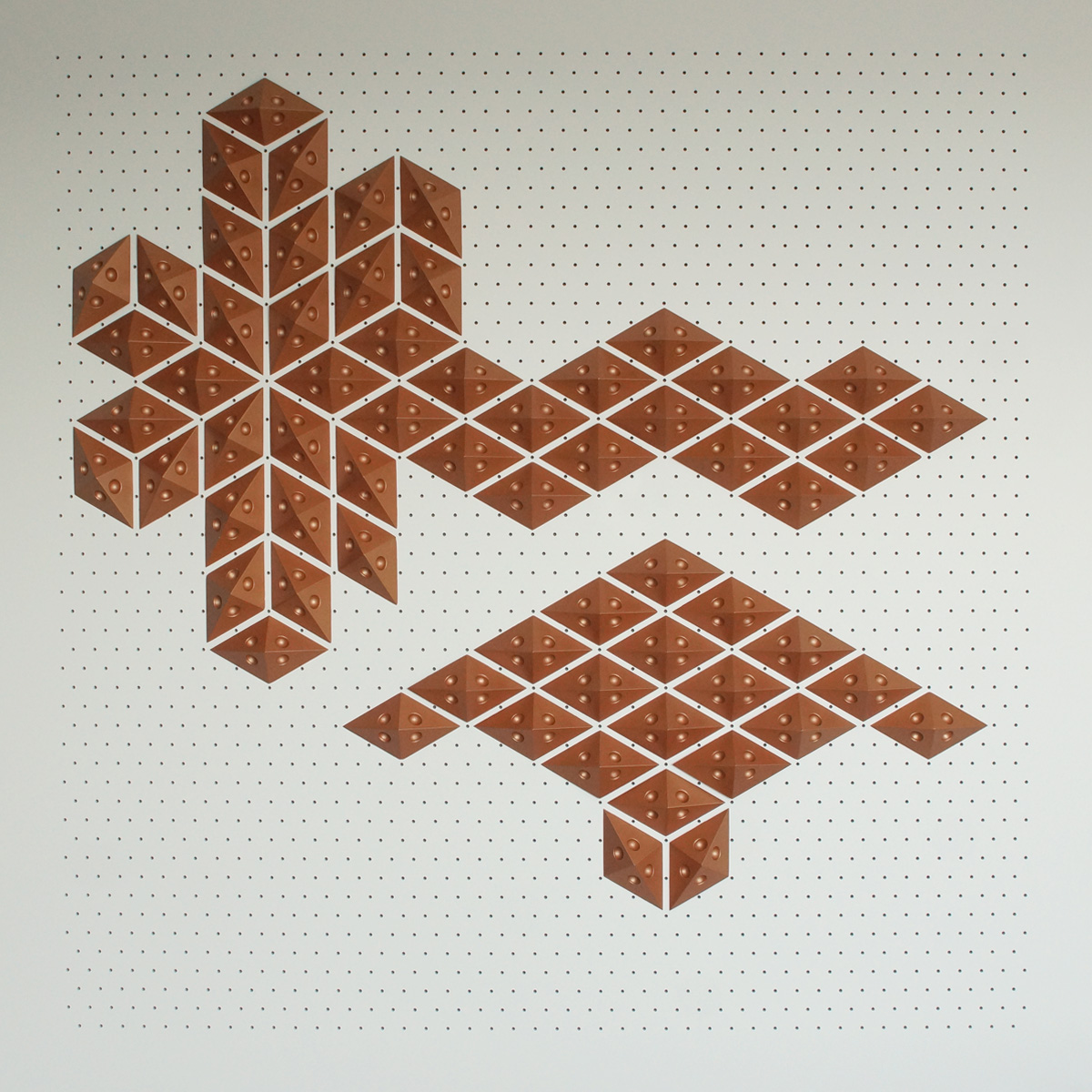 A perforated wall element and shiftable three dimensional shaped rhombs result in endless combinations of designing an individual picture. Finger sized notches unify a decorative element with practical grips, unleashing ones creativity. The bright, slightly reflective copper lacquering, combined with shadows drawn by light sources are underlining the result of an always changing overall image.