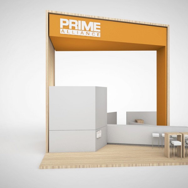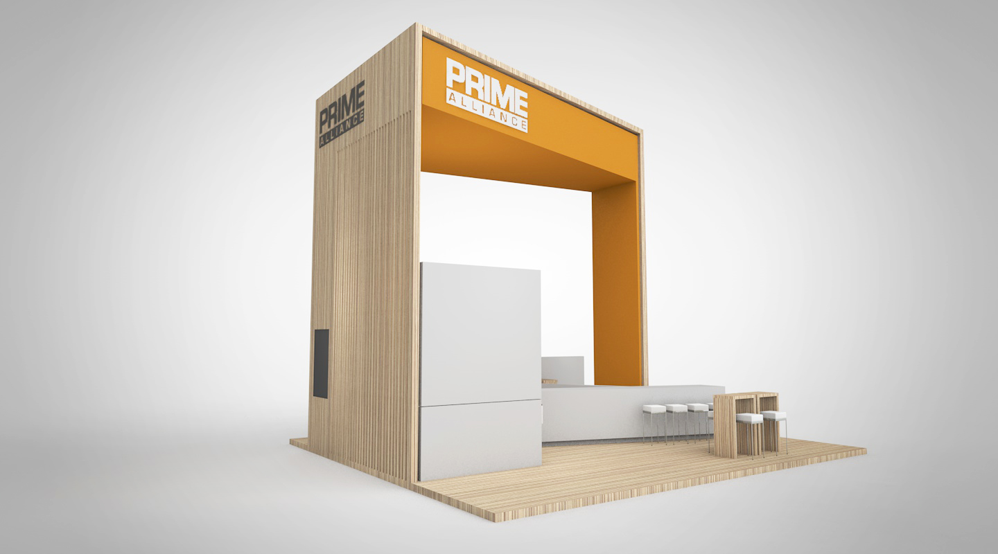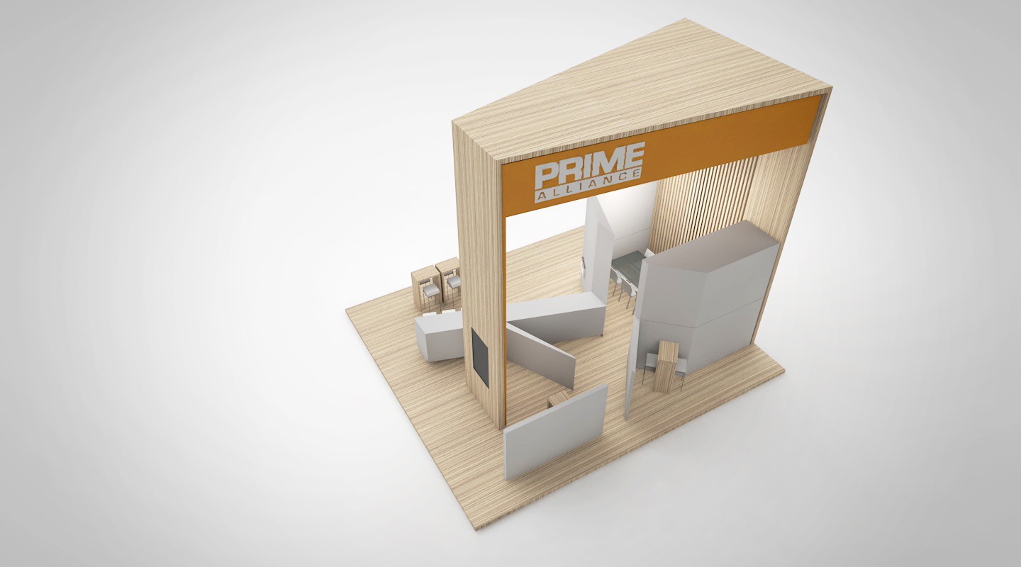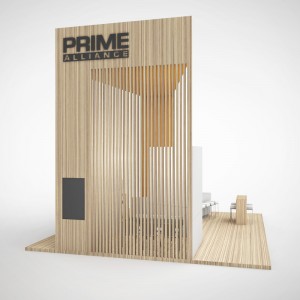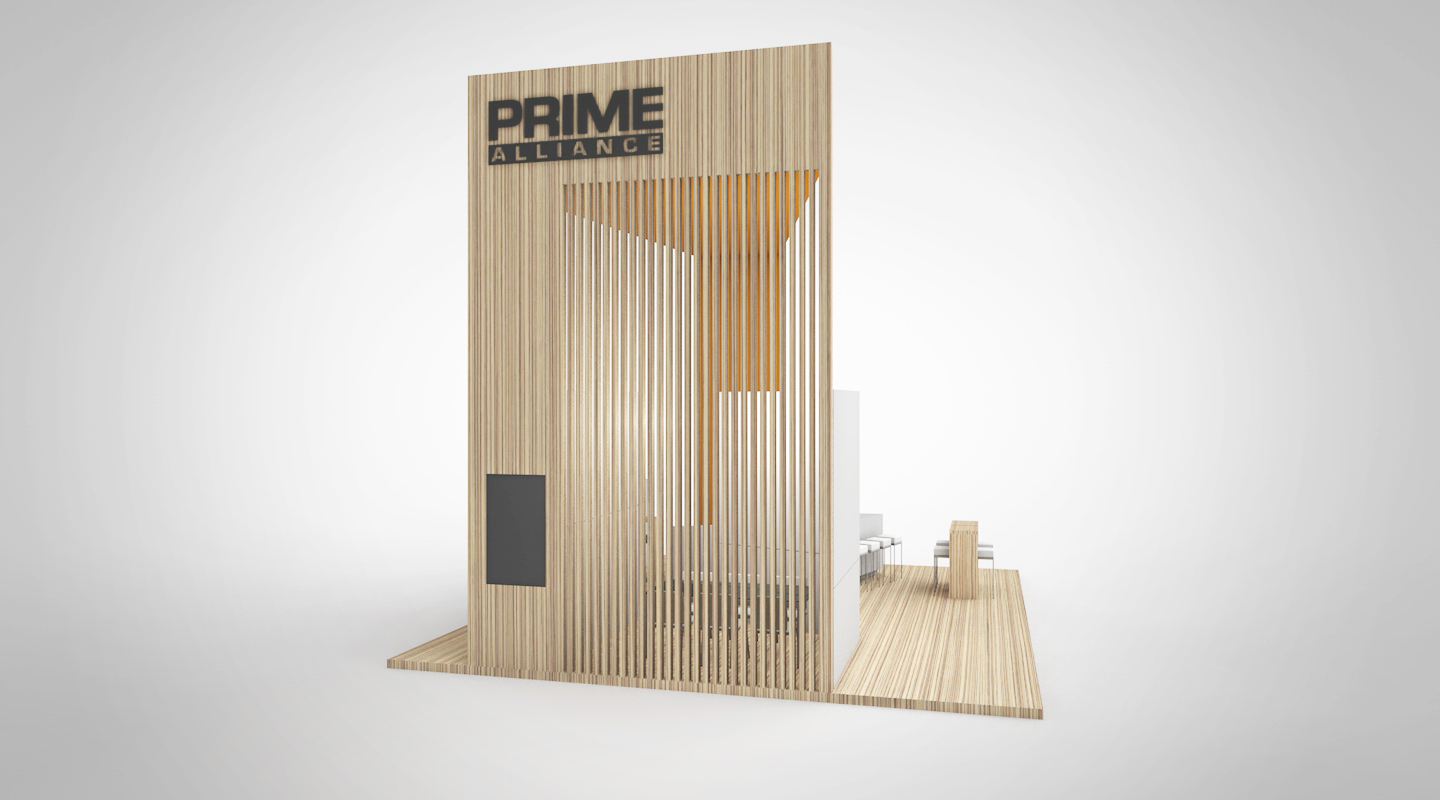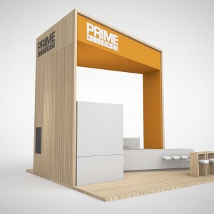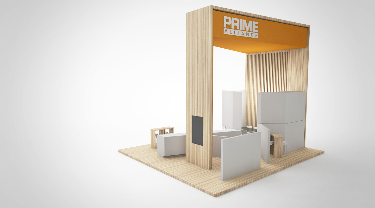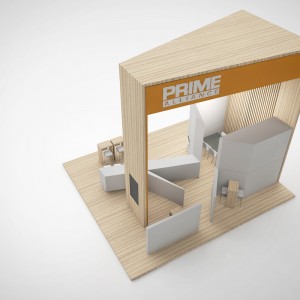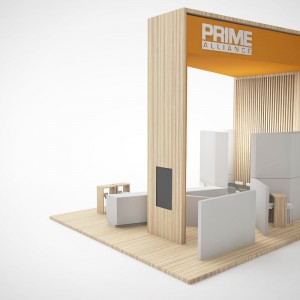 PRIME event booth concept ’20 A coherent concept in clear white with warm-light wooden elements which is implemented in a slightly adapted form at the leading trade fair for the energy sector Enlit in Milan.