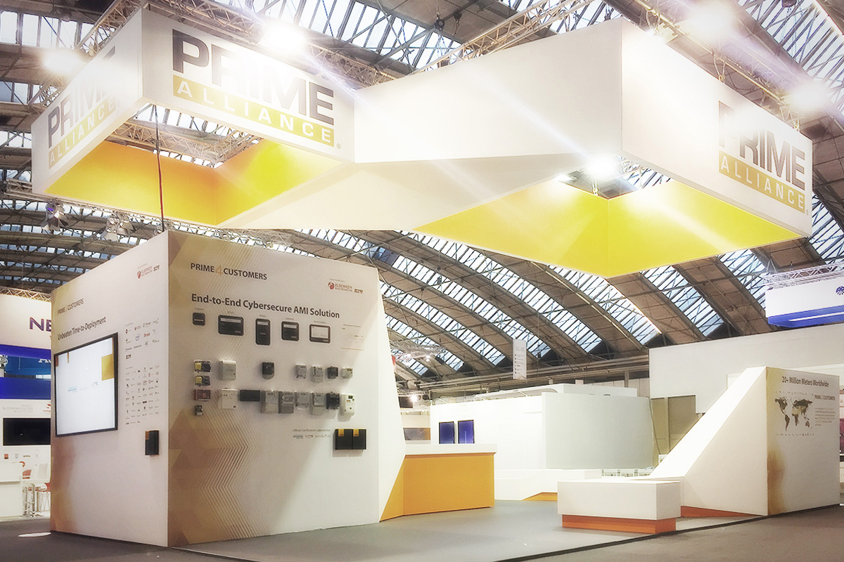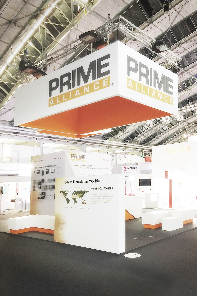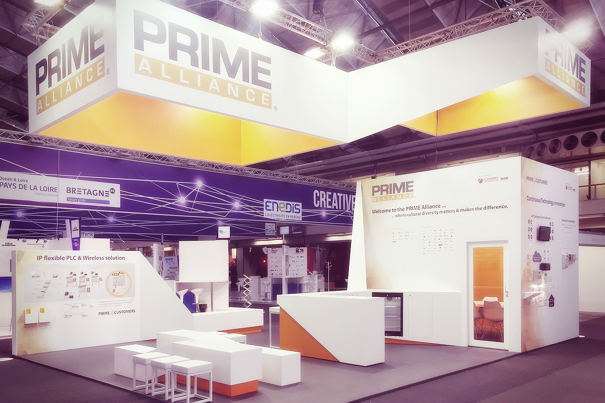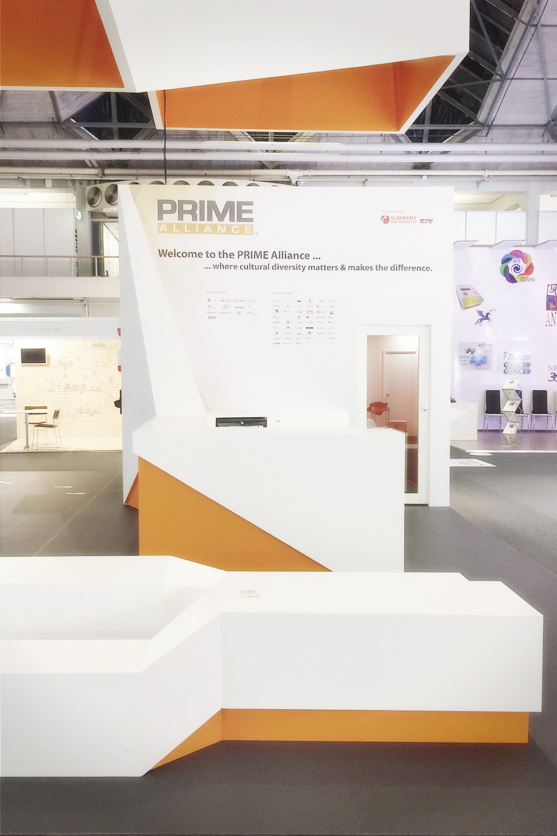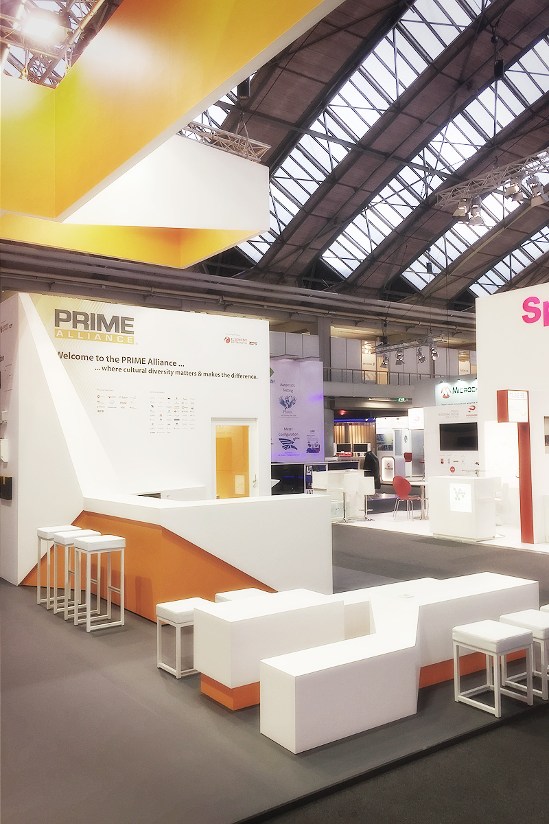 The banner structure conveys its extravagant formal language to the stand elements – the ensemble thus forms a harmonious insularity with exciting perspectives. The concept was developed and implemented for the PRIME Alliance at the European Utility Week in Amsterdam.